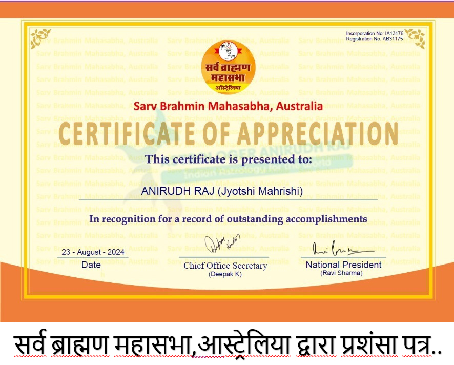 सर्व ब्राह्मण महासभा,आस्ट्रेलिया द्वारा प्रशंसा पत्र.